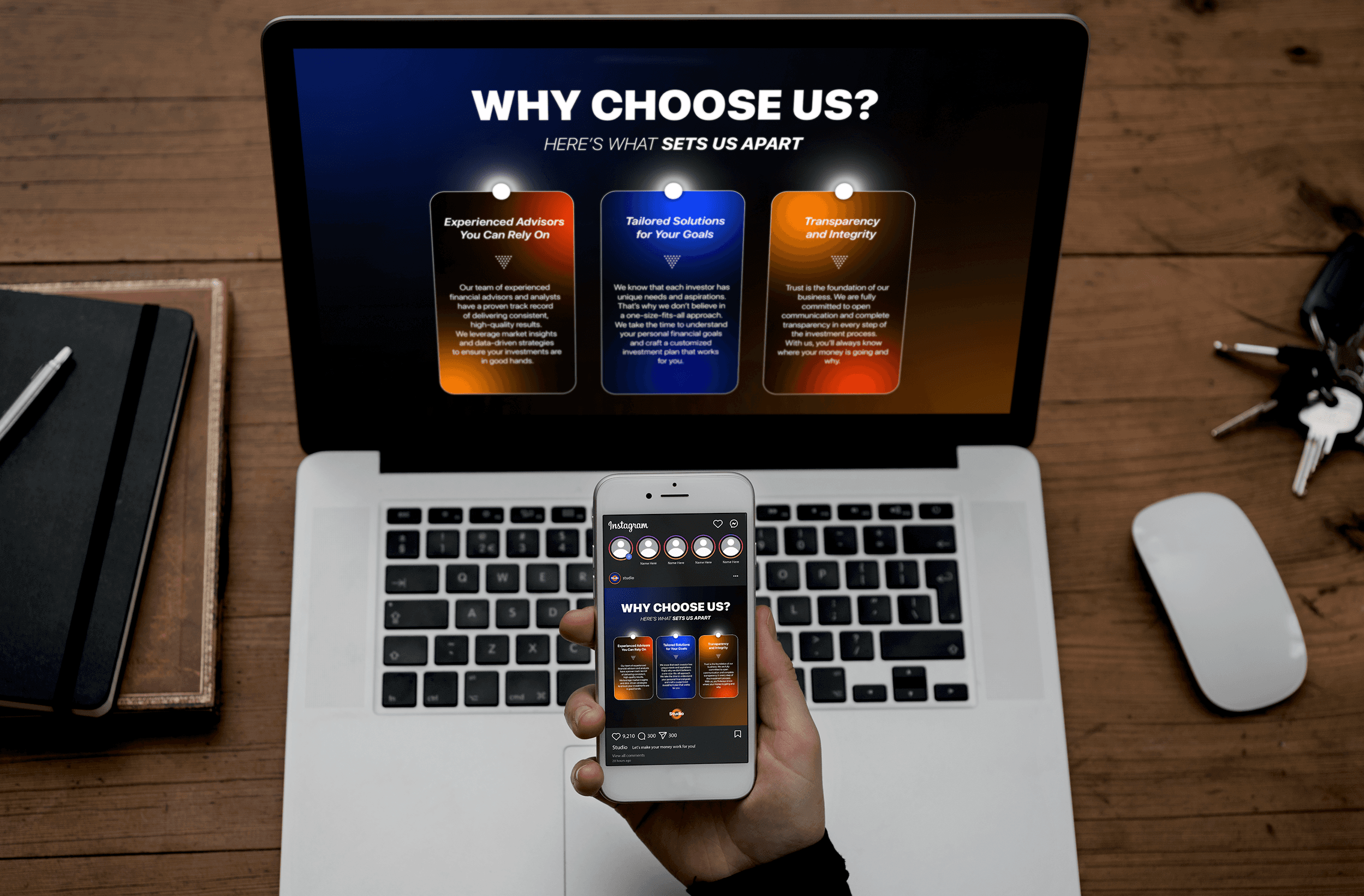 Created an emotionally engaging identity through warm gradients and client-focused messaging, building trust and emphasizing their commitment to client success.